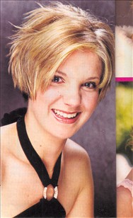 Enliven a layered bob by starting with damp locks, adding spray gel and blow-drying with a large paddle brush. Once hair is barely damp, flick out ends on the surface, playing up textural appeal. Detail the surface by hand using a touch of shine serum.
