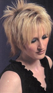 A short, shaggy cut that's asymmetrical from side to side takes on a plume-like effect when point-cut in front. Flat-ironing makes crown pieces stand up. Pale, warmer hues of blonde are paired with light orange/red placed at the back and used to outline edges.