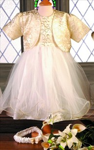 A beautiful dress with full organza skirt, detailed bodice with matching bolero jacket and classic headband