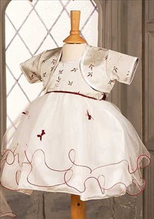 Stunning ivory dress, fluted tulle skirt with pretty wine detail. Complete with matching bolero jacket and headband.