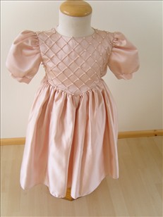 Stunning rose gold satin dress with pearl beading to bodice, large bow and ribbon to back.